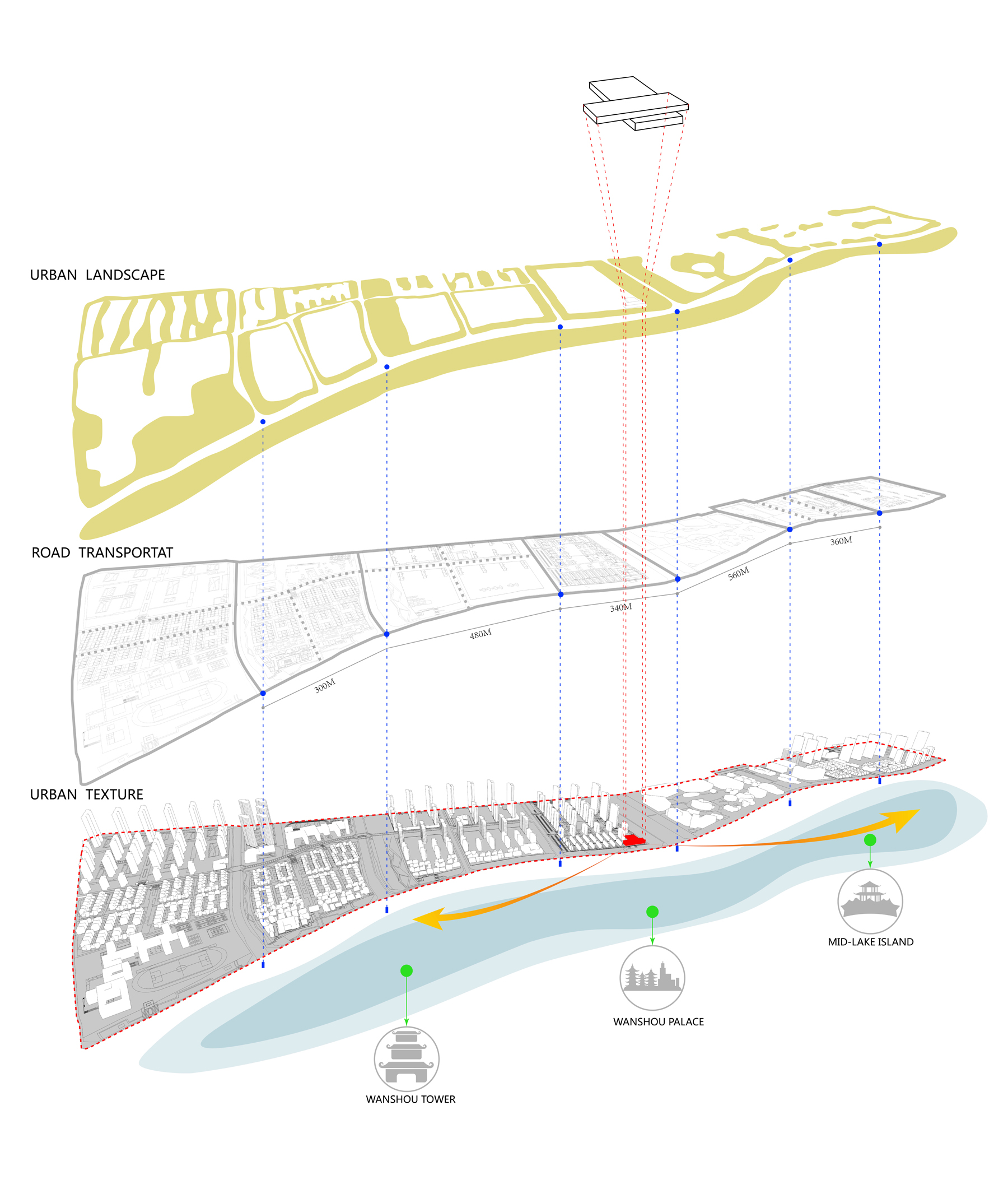 上位城市设计用地所在区域沿着象湖蜿蜒的湖岸。万寿宫与万寿塔分居南北,视觉体系可谓广袤,因此建筑本身应该可以清楚地观察到城市风貌。项目的最初创意是抬升地形,保留城市绿地并建造一个新的建筑,填补沿湖规划形成的地标节点空白。因此,建筑使命自然是实现天然场景、新建筑、城市主义的闭环。为了实现这个目标,必须借助清晰的标高体系和精确的体量。而这个举措导致了视角的变化,即创造高度的场所和主体建筑将可以从同一个视角看到,会突出其自主权。