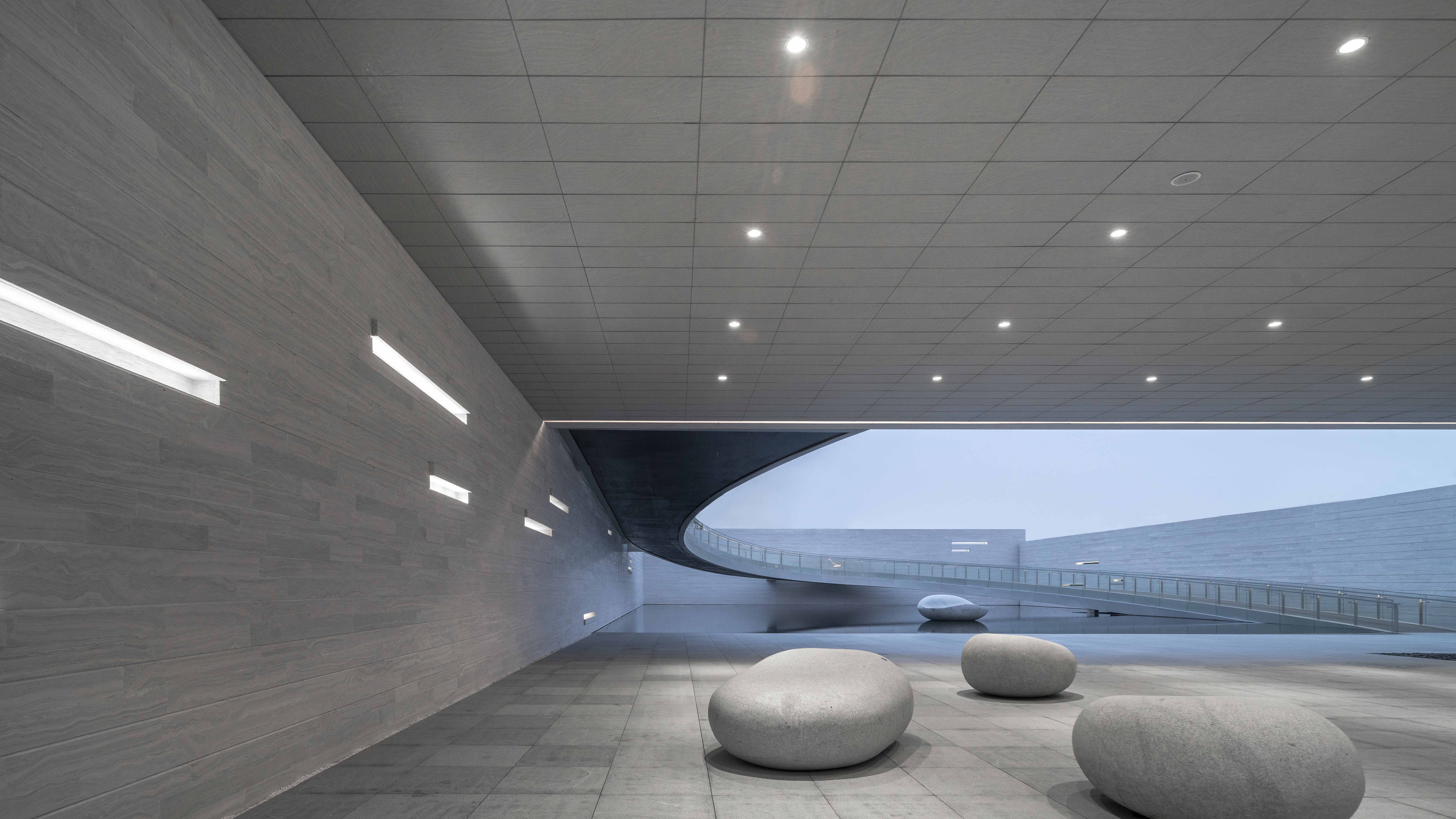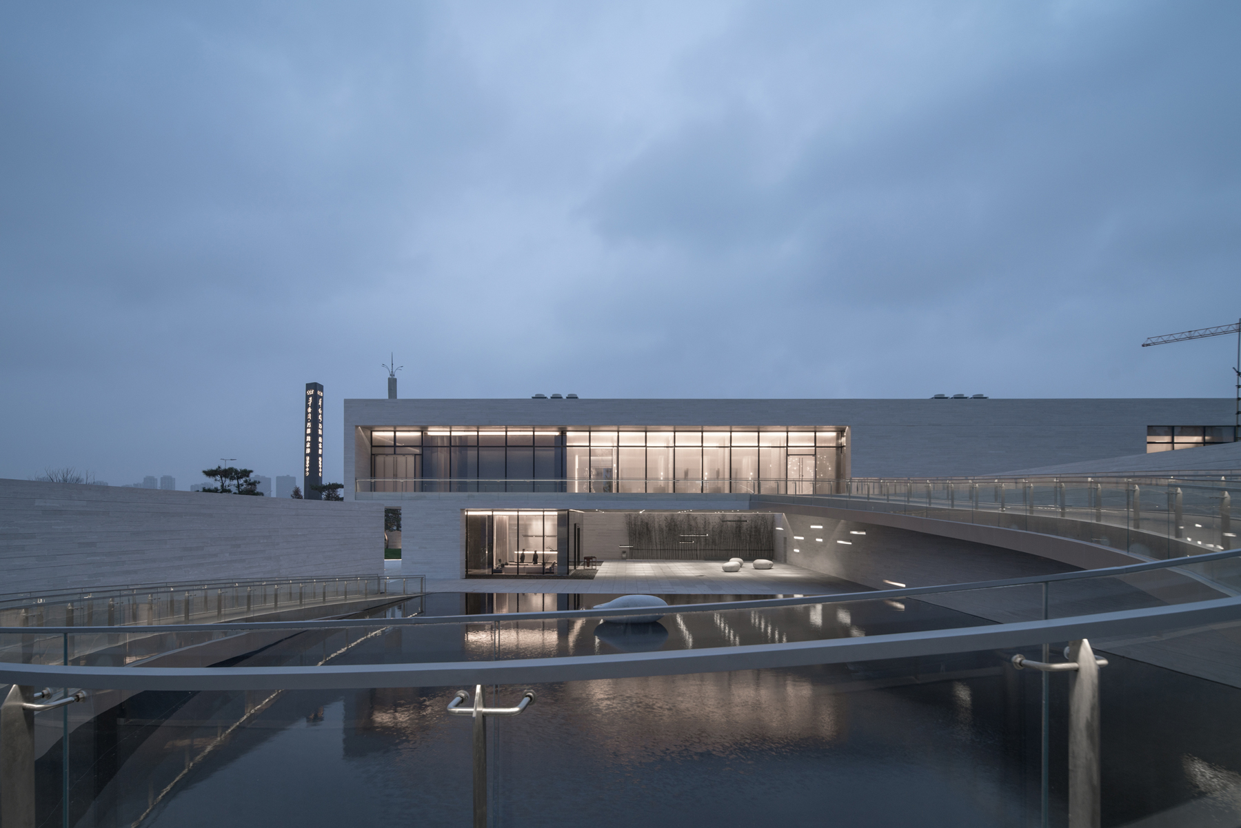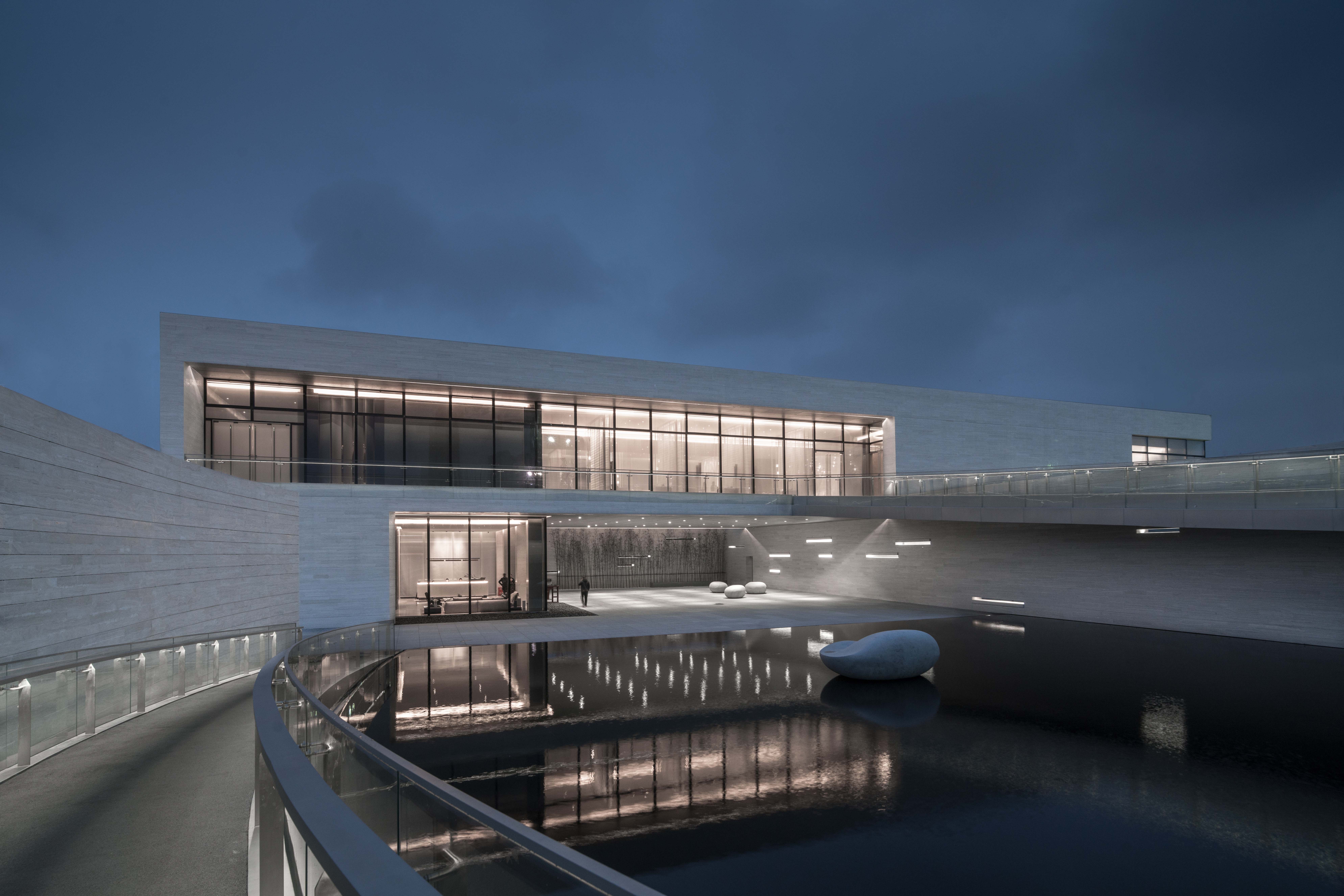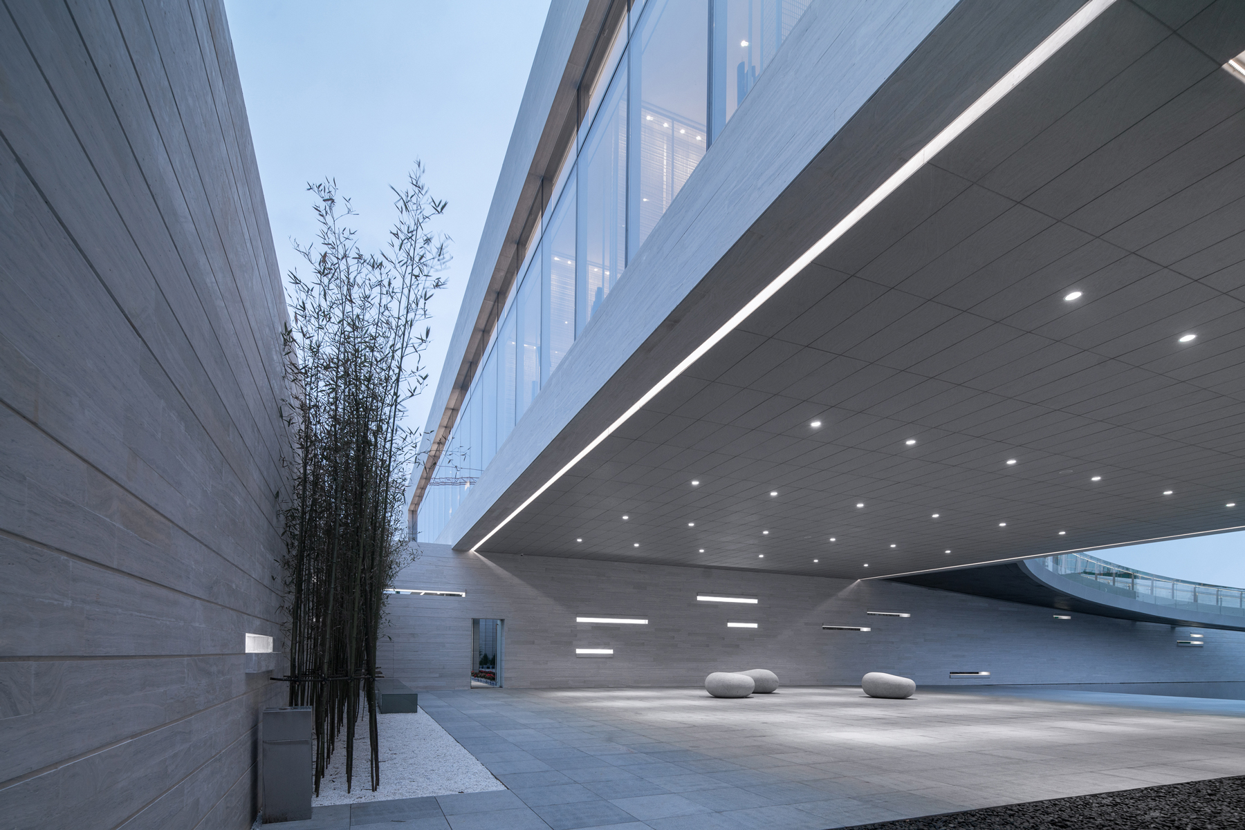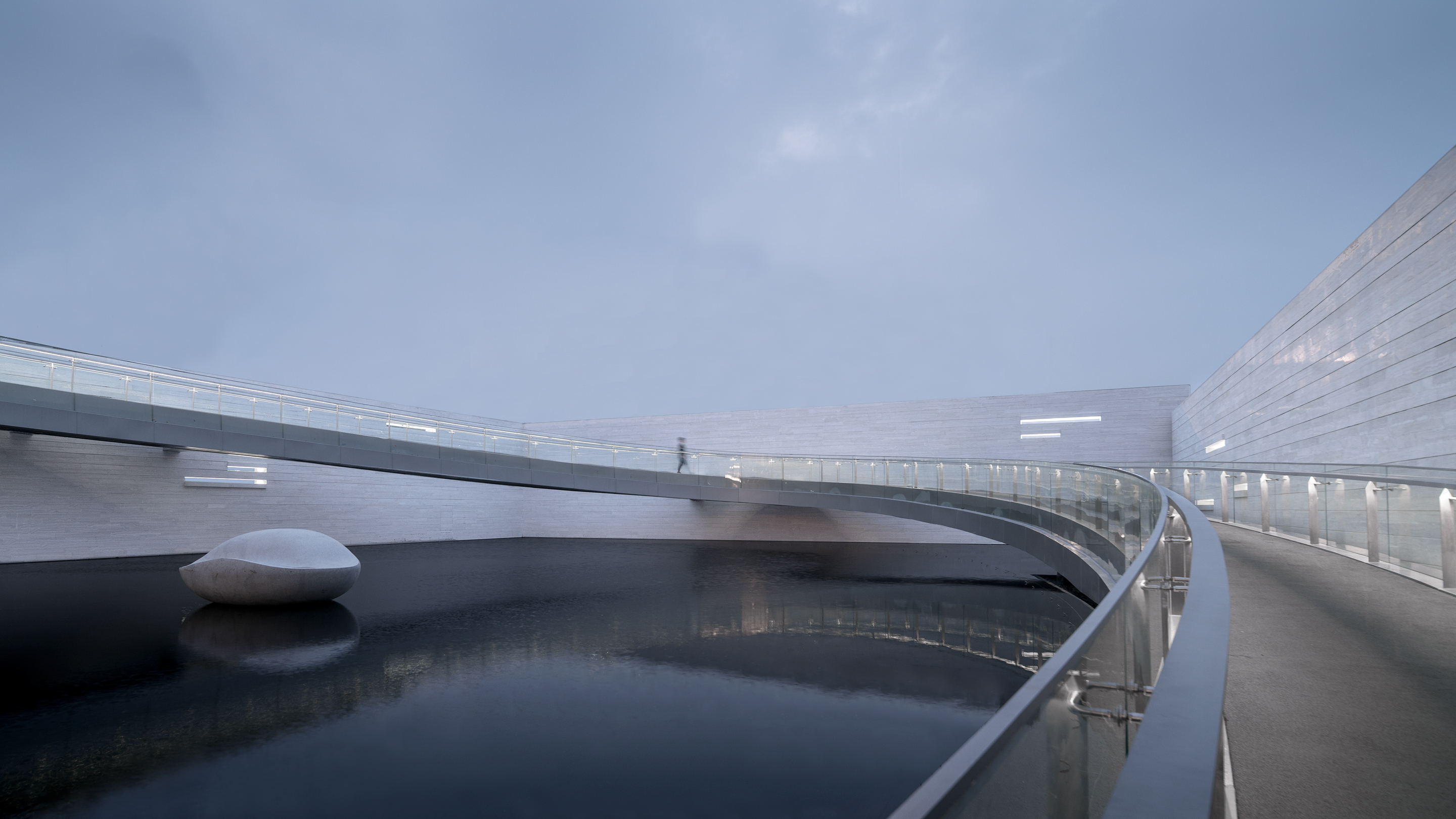 尽管类型概念有对历史的牵强附会之嫌,而归类总是可以务实地表现某种共性。不同于古典城市意象中的步履蹒跚,终登高阁,一睹美景之流,为了创新地设计“高度”,引入桥(坡道)的概念就更具现代趣味,更集约地利用建筑学话语,也无可挽回地落入时间和空间的老生常谈……所以,一座有雕塑感,一类特立独行,一种带有形式批判的环桥被“重复”进了设计理念,既作为主体建筑的连接器,也是对于相邻九州大街下穿隧道的回应。