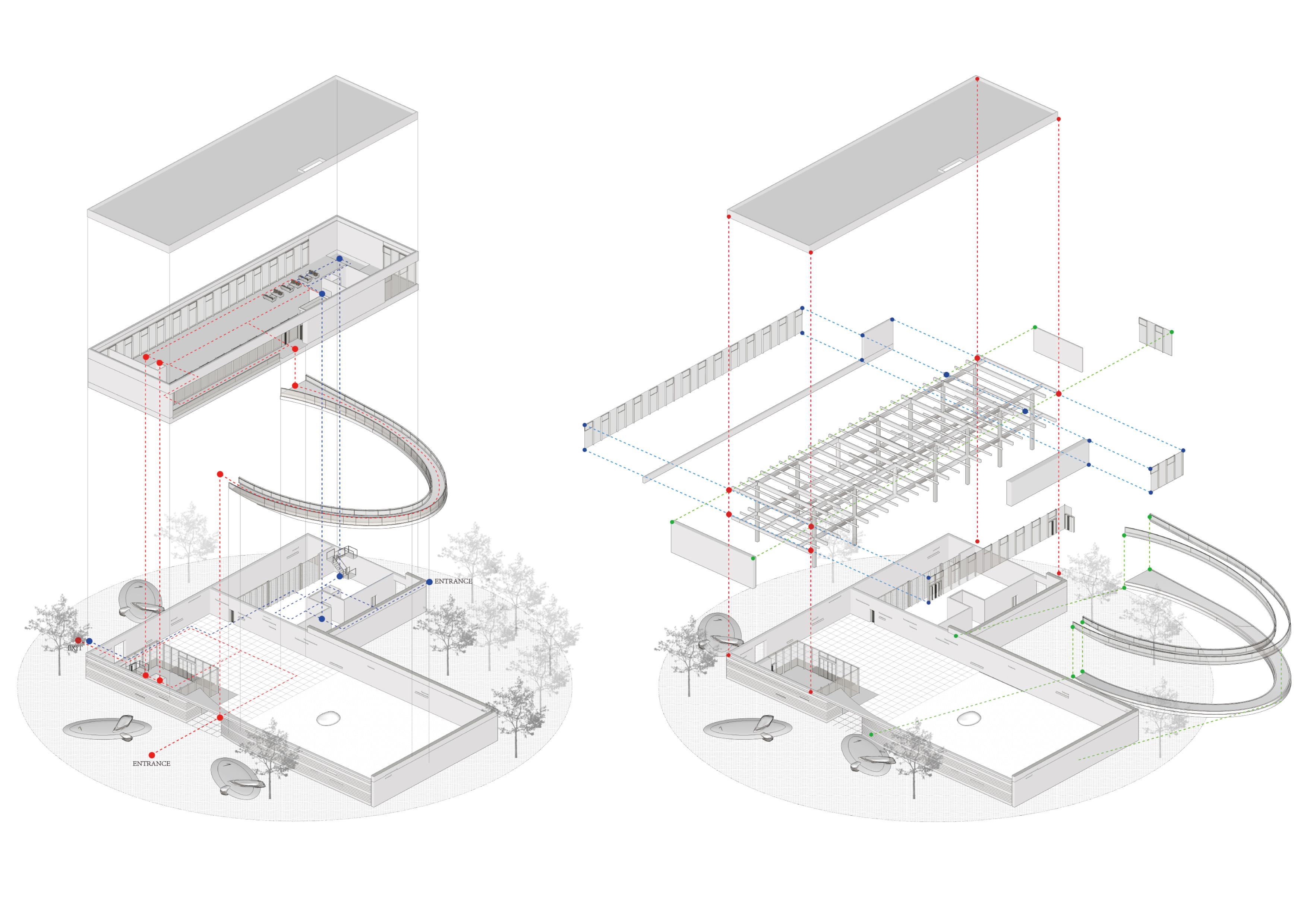穿过城市绿地,抵达去纪念性的庭院入口,目光所及的是分立于入口轴线的三条流线:左侧为玻璃门厅,直入进长达21M结构跨度下的休憩区或移步登上右方的环桥。两条流线的起点也是终点,重点是架空层作为设计的重要理念,创造了小型建筑的公共性。