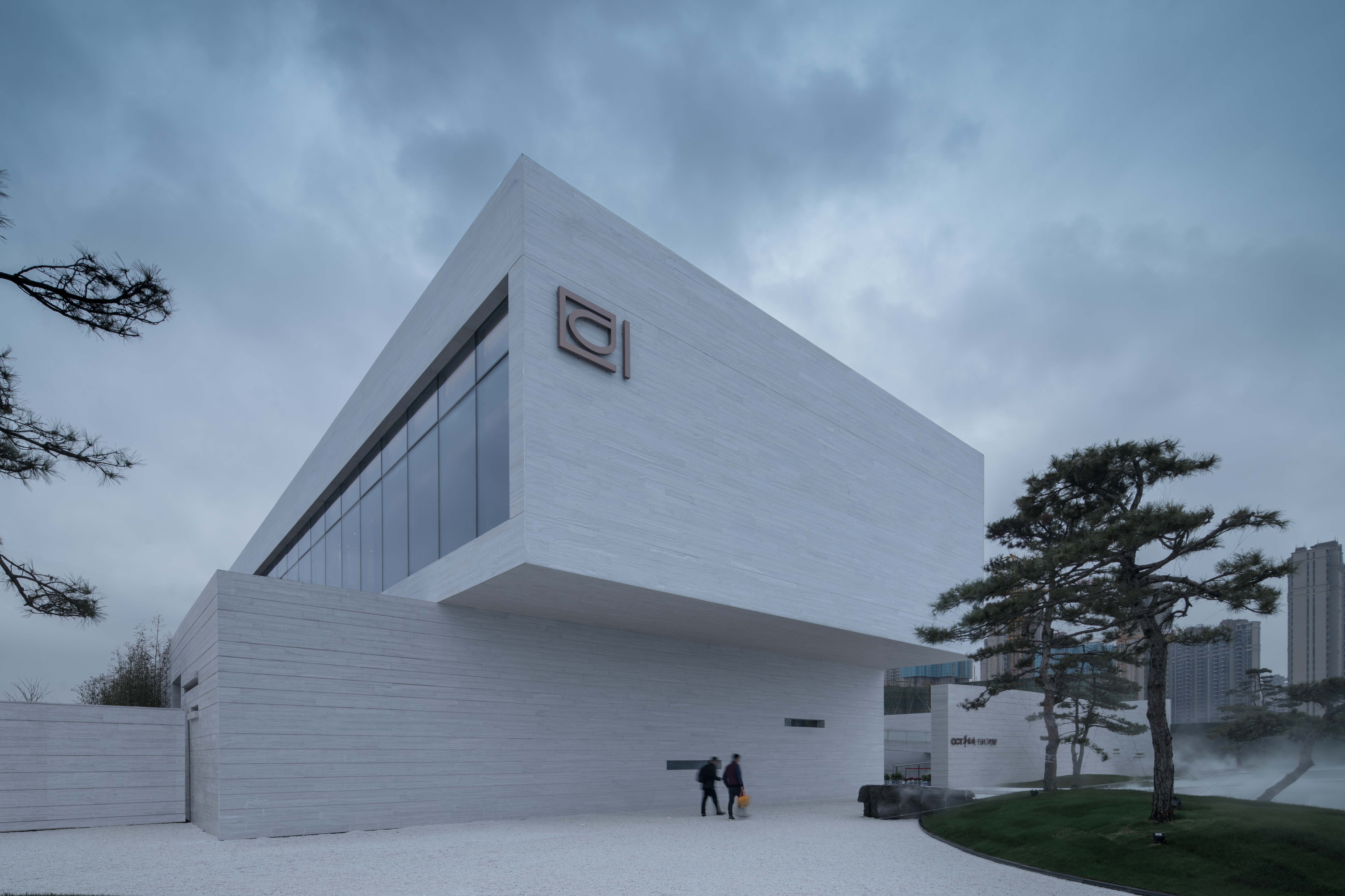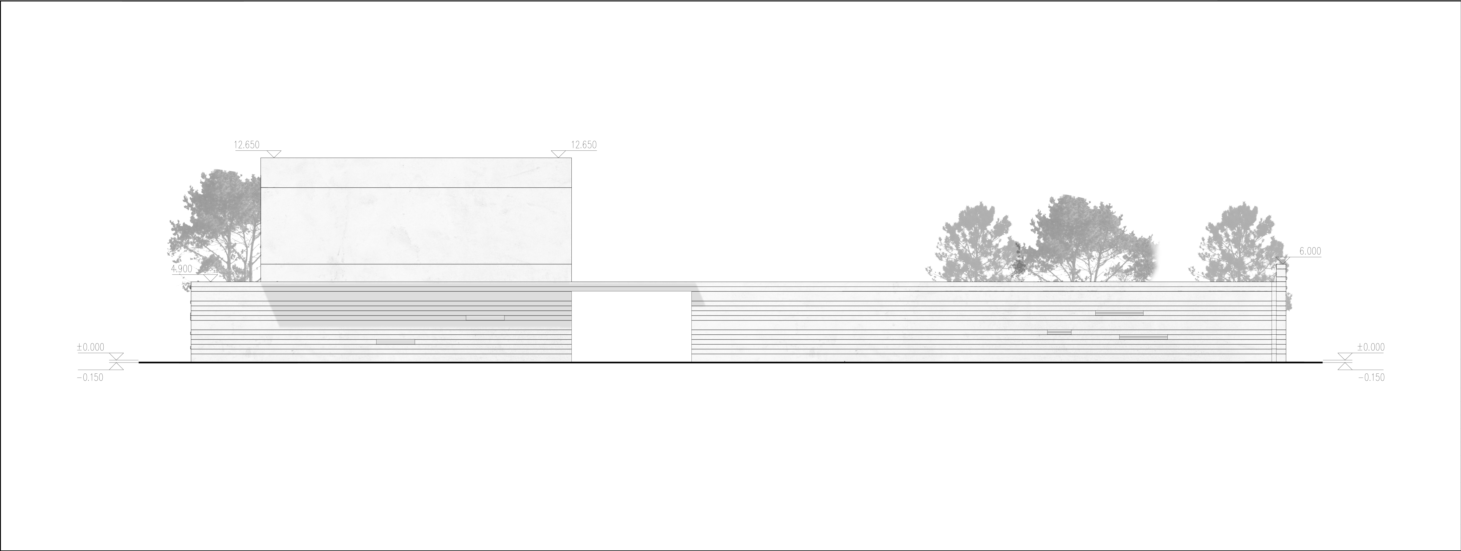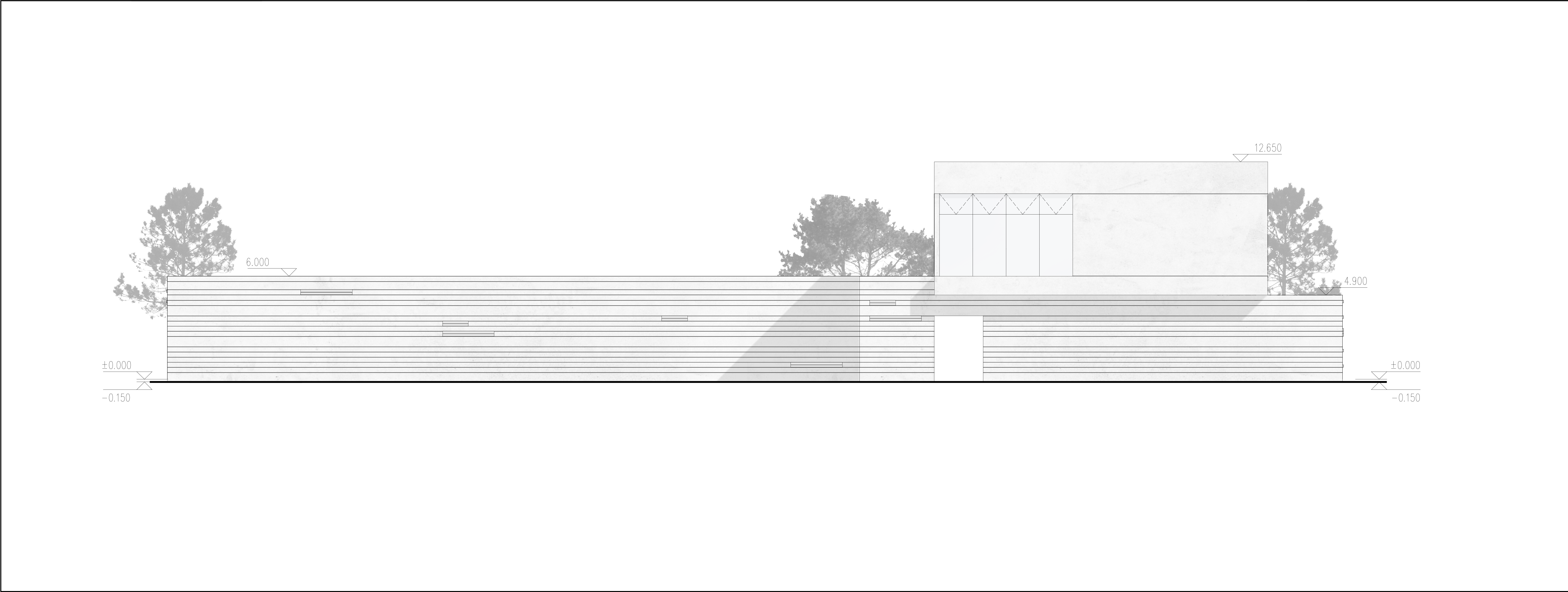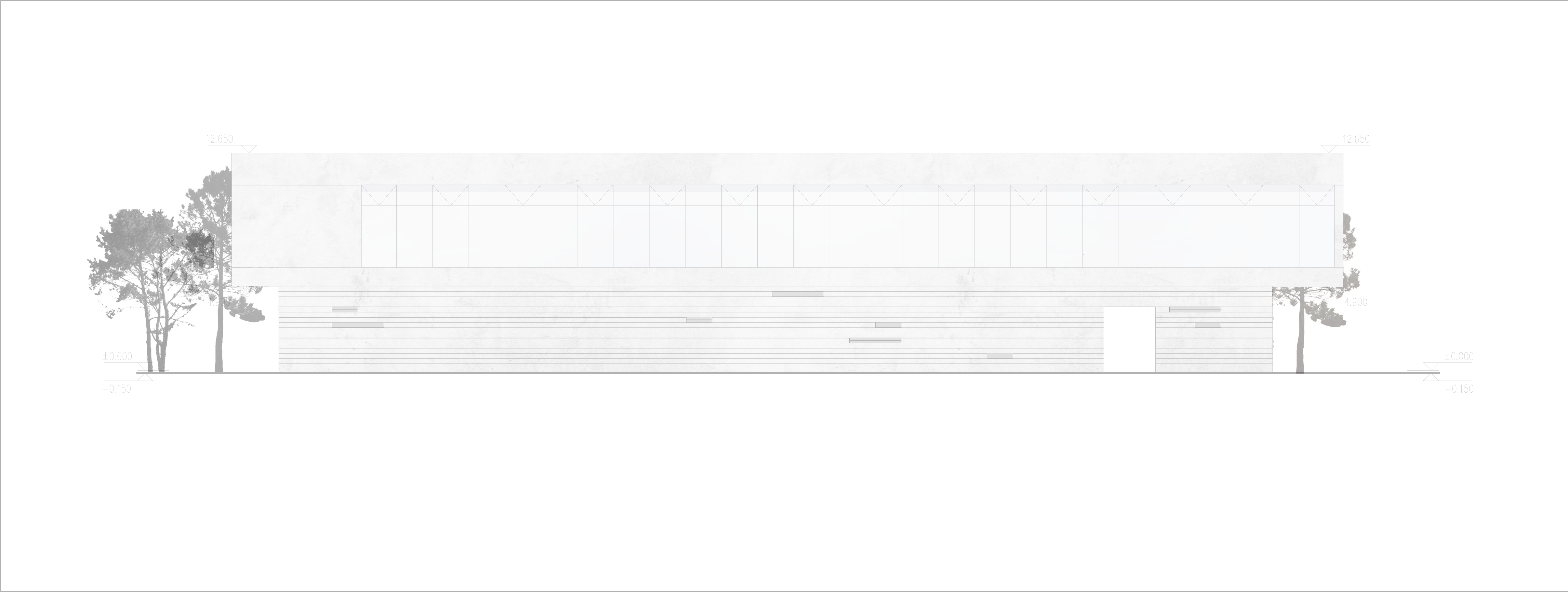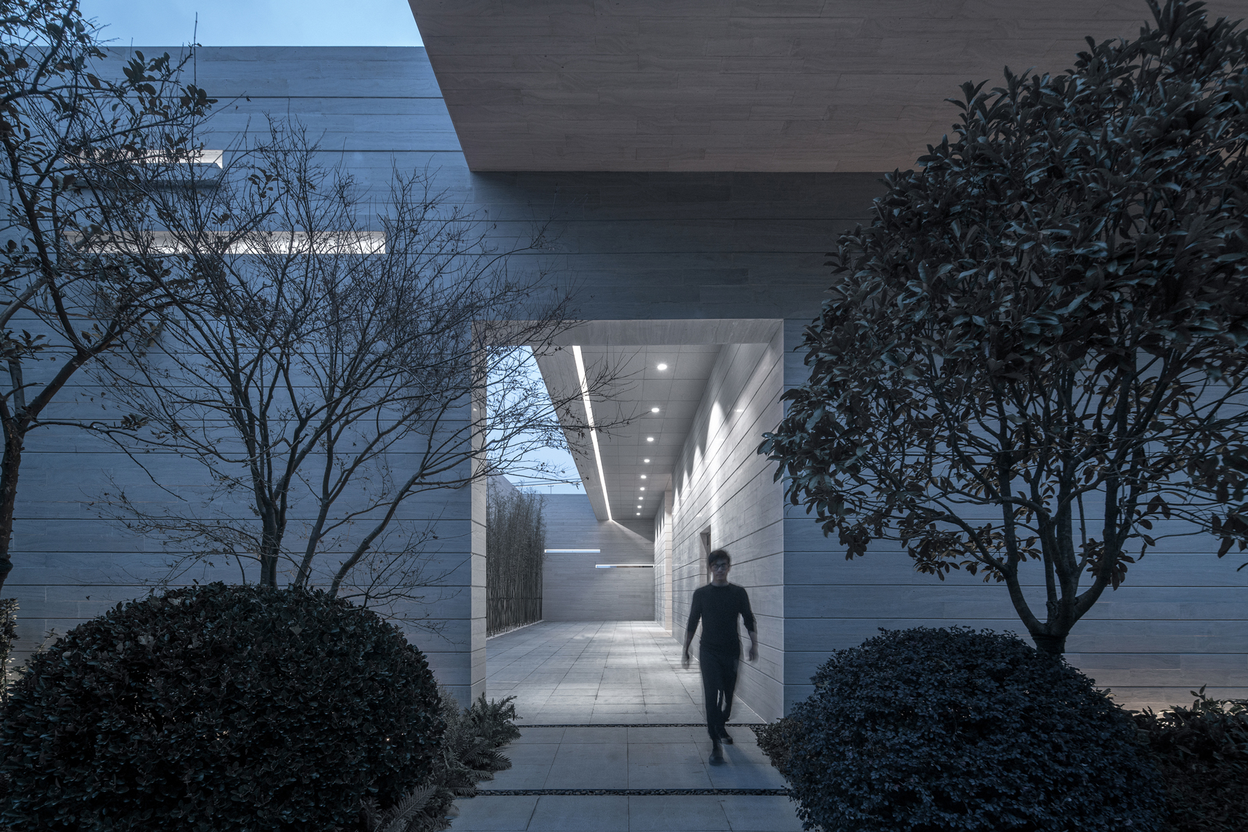 作为墙体的建筑扮演了非常重要的角色,承重的院墙更加凸显了建筑最终形式的水平排列结构。我们希望表现建筑内外与场所的真实逻辑,强调材料运用的功能性、表现性与体系化。19000块25度灰色水泥板挂在亲地化的体量上,创造出极简细节。在院墙镂空的阴影中,在随机排布的构图中,空间被创造。通过横向槽缝的联系,实现室内外场景的渗透,增添了概念与视觉上的标志意义。