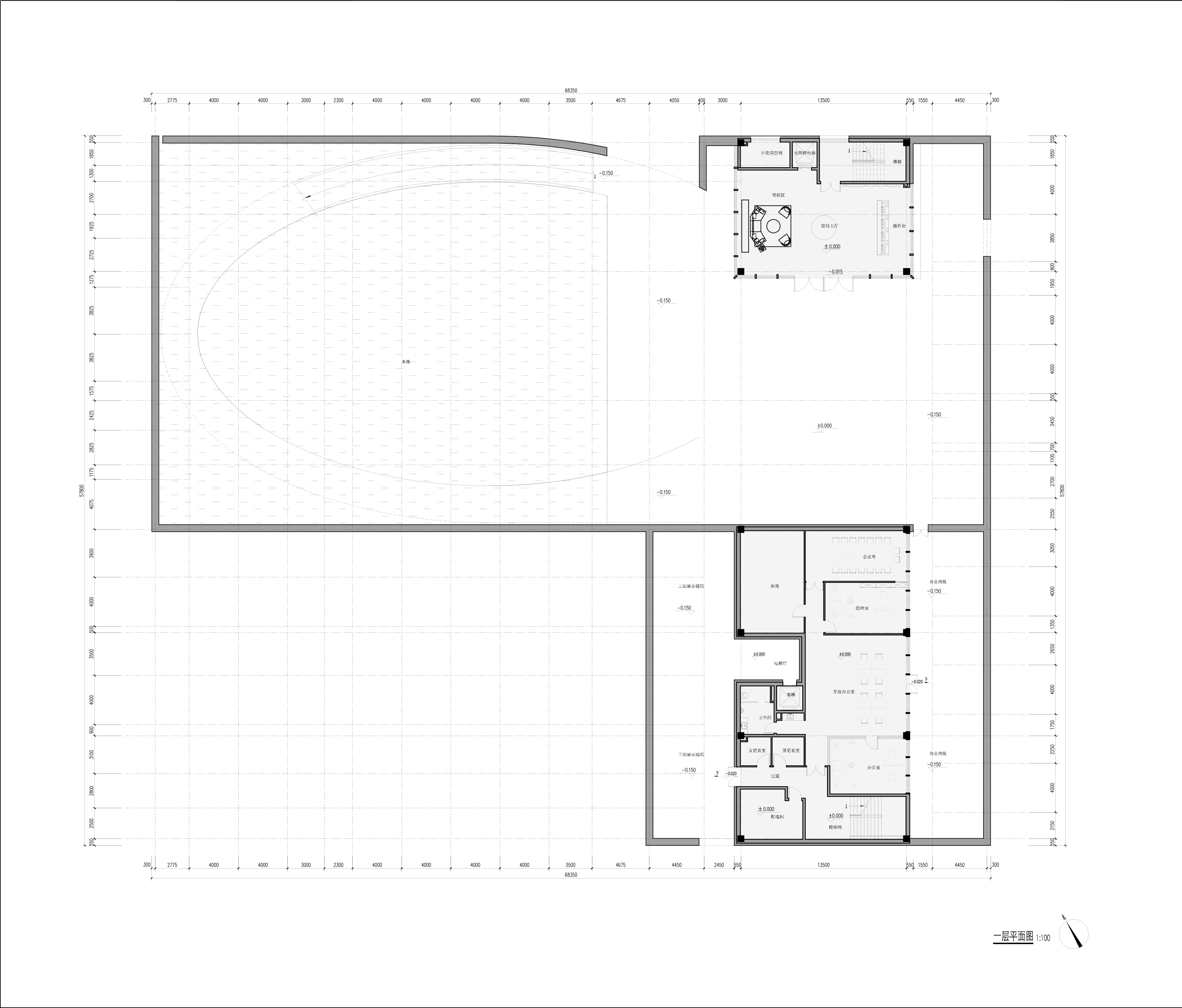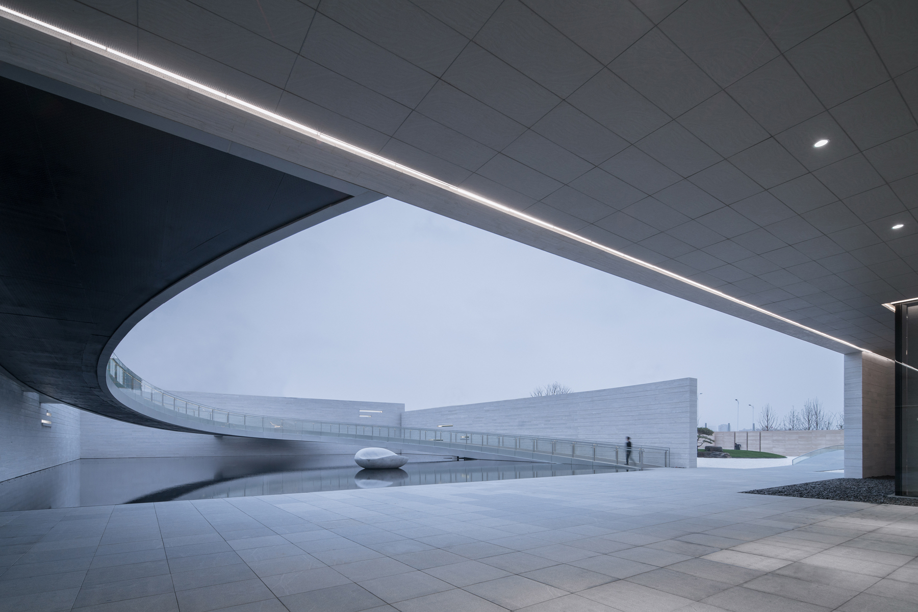 我们从体量上着手,将矩形展廊嫁接在两进院落之上,接待大厅,展示大厅,休息区横向排开。下方的一进院落向北开放,通过围合环桥形成的弧形墙体引导观众向入口靠拢。二进院落纵向布置办公区,同时向南侧外部庭院开放。以此为空间框架,环桥对侧不失时机地展开扩容,形成了门厅的前导区。由不同尺度的空间累积,平面及高度上的形体复制,带来了两部分建筑之间的一种动态而克制的独特观感。