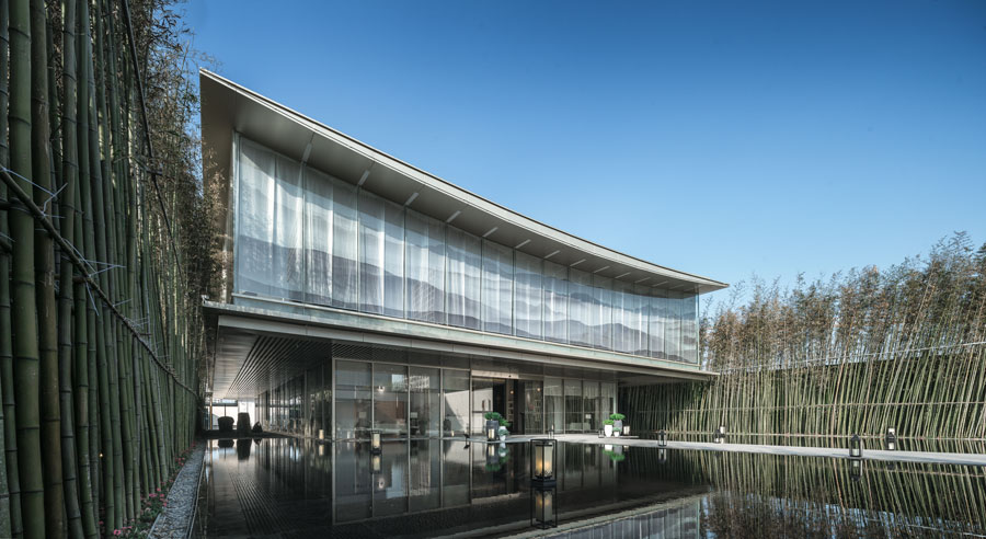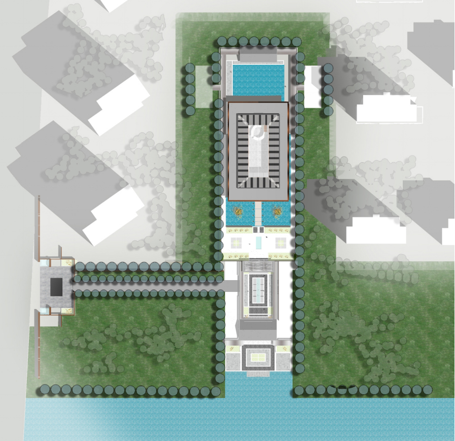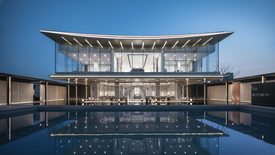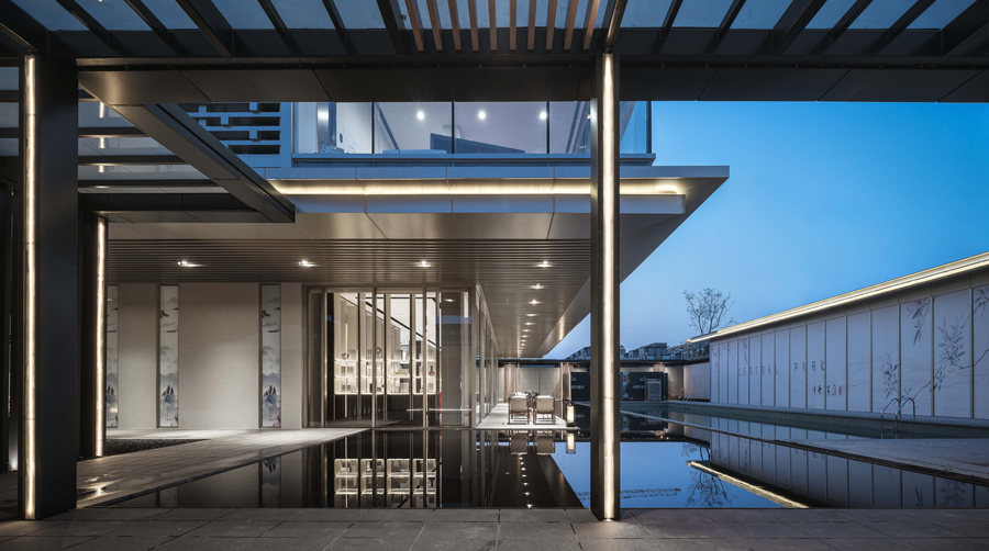 设计以传统院落层层递进的空间格局为布局,并在中央主院建造一个“漂浮”于水面的通透玻璃体,作为整个序列的核心。出檐深远的金属屋面,半室外的亲水走廊,结合水景庭院,于光影摇曳中以现代建筑语言描绘出具有传统文化情感的空间氛围。