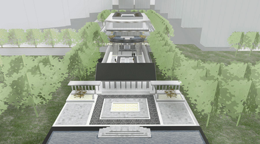 主轴景观的序列起于河边,由一个半围合的广场与河流相联系,通过一个抄手廊围合的长形院子,进入水院,豁然开朗,晶莹剔透的市民中心“漂浮”于水院之中,整个空间序列达到高潮。