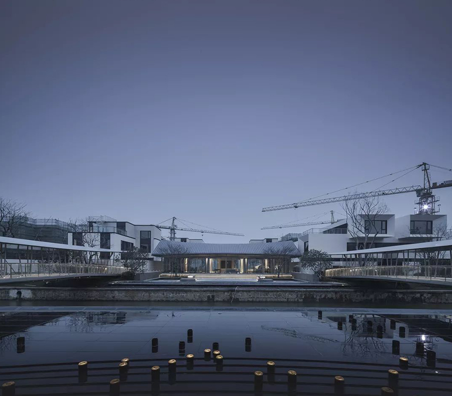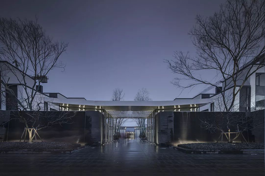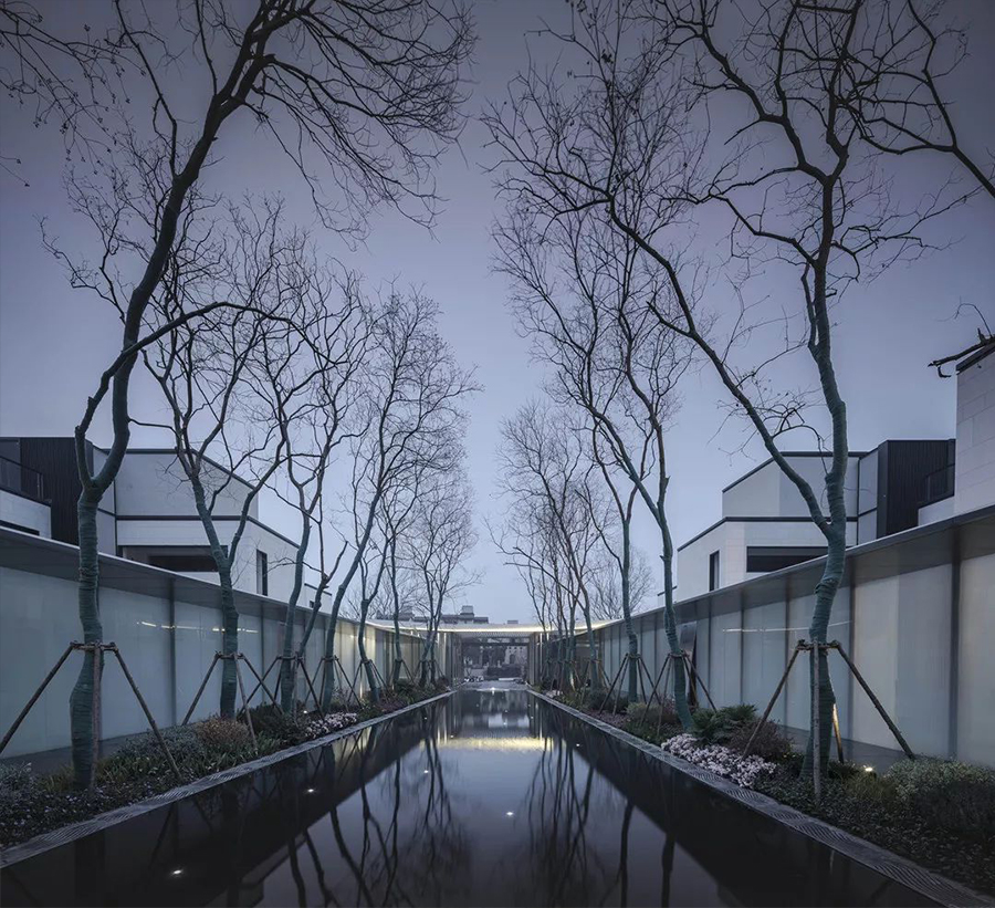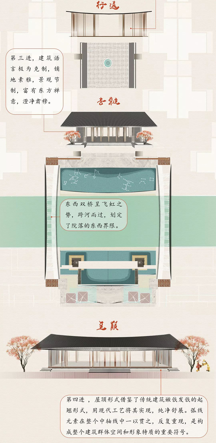 江南水乡的重重院落以一种富有秩序感与节奏感的多重合院来再现,营造适应现代生活美学的前场空间。将传统的园林空间的起承转合与一步一景之感用现代建筑语言进行转译,结合小品景观来化物为境,以次体现简洁轻盈又不失大气的美。