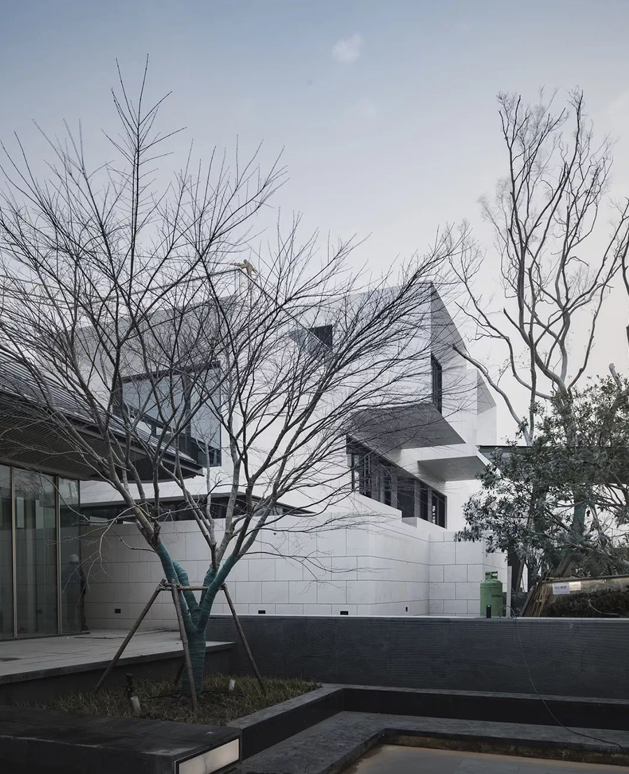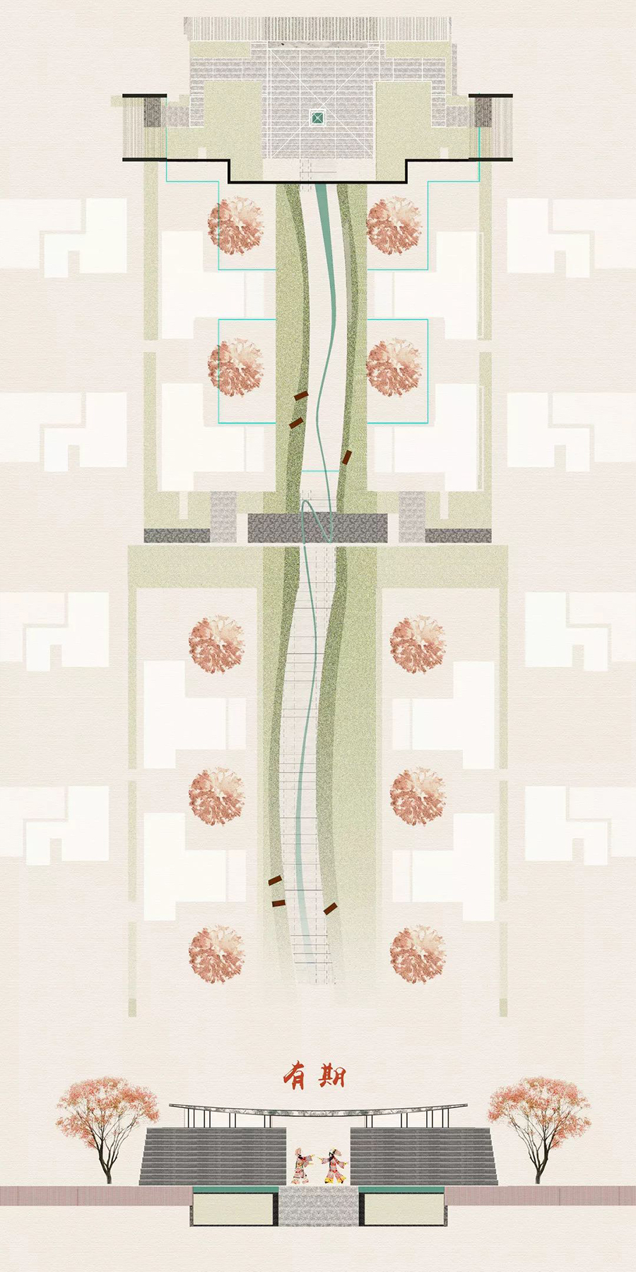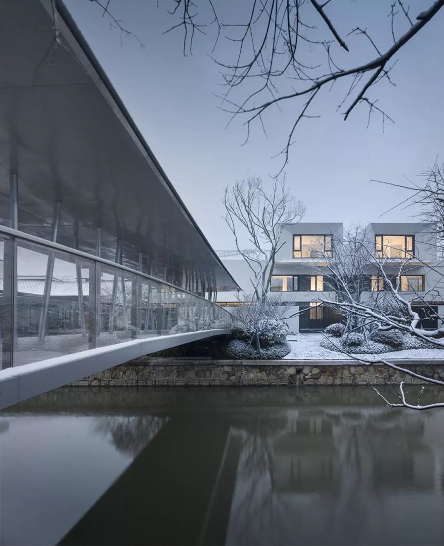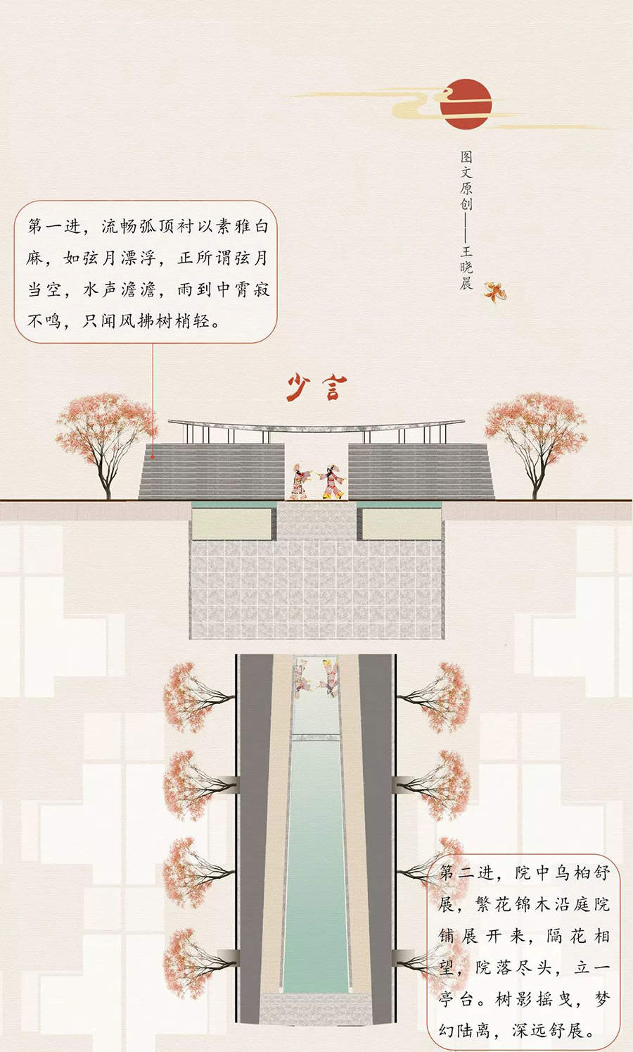 江南水乡的重重院落以一种富有秩序感与节奏感的多重合院来再现,营造适应现代生活美学的前场空间。将传统的园林空间的起承转合与一步一景之感用现代建筑语言进行转译,结合小品景观来化物为境,以次体现简洁轻盈又不失大气的美。