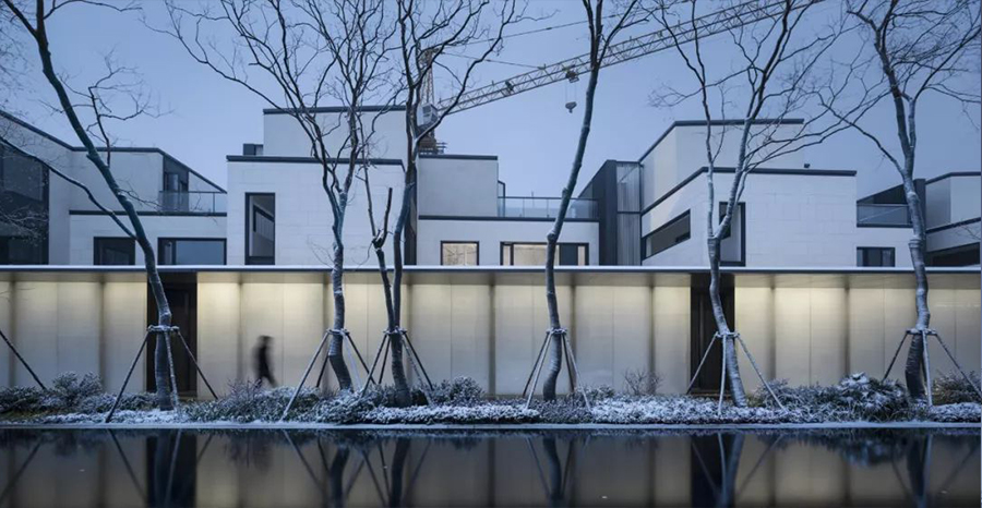 在万科大家的建筑图卷中,处处可看到西方的极简技法,那些线条语言、色彩色调与石材立面,与东方的传统建筑形制相融合,形成了万科大家的现代新中式建筑风格。