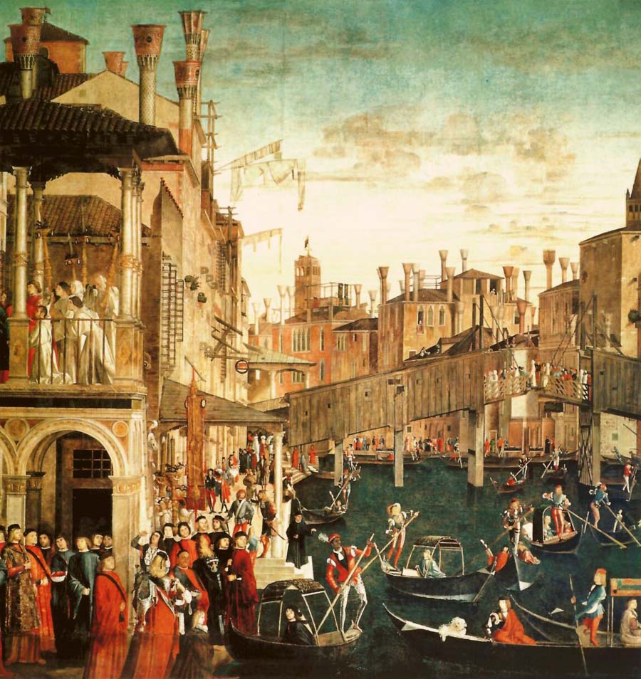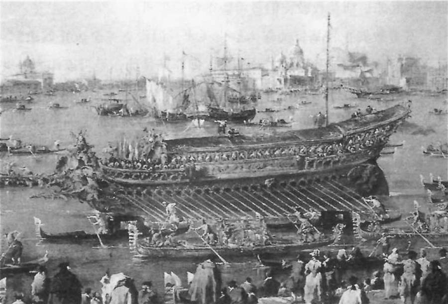 虽然这个案例没有被采纳,但对于建筑营造过程的仪式化的方式,在解决技术问题的同时,表达对自然的尊重,值得我们尊重和反思,但想想威尼斯人对海洋的感恩和崇拜,也就是情理之中了,从早期逃避匈奴人威胁在滩涂中建立共同体,到两次与热那亚人的战争中利用泻湖和暗礁作为阻碍才险象环生,到后来成为游弋于地中海建立海洋商业霸权,海洋崇拜是比基督教或东正教更加现实的情感信仰,12世纪,威尼斯人正式制定了威尼斯的国家庆典“海亲节”,海亲节定在元首皮耶托.奥赛罗二世出征之日,那天也是耶稣升天节,每年的这一天,元首都会率领政府的高官,登上绯红,金色相间的御用黄金船。在万众瞩目之下他对着大海高声地说:“海啊!我要与你结婚!要你永远属于我!”然后,元首将事先准备好的戒指扔进大海中,仪式正式结束,民众迎接元首回港之后,疯狂庆祝。这是对理性的威尼斯人感性的号召。