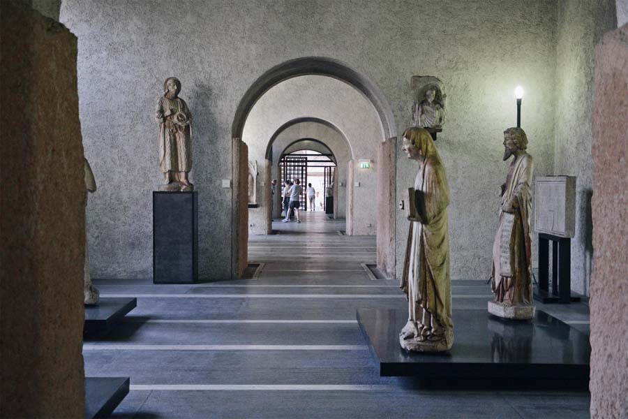 “古堡博物馆“的地面,斯卡帕用石条和混凝土地面利用拉丝和抛光的工艺,纹理顺着迎光来的方向,使光线呈现出波光粼粼的细碎效果。另外在地坪与墙面交接的踢脚线,设计了贯通周边的”水槽”,在并没有排水需求的室内部分,创造出浮岛的空间感和水流的暗示。