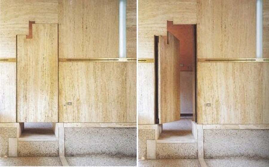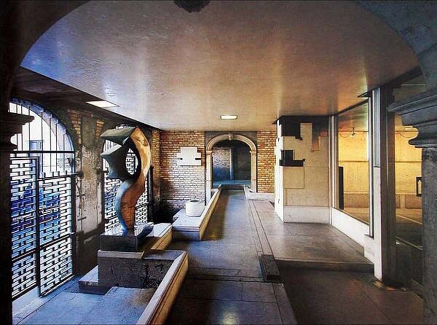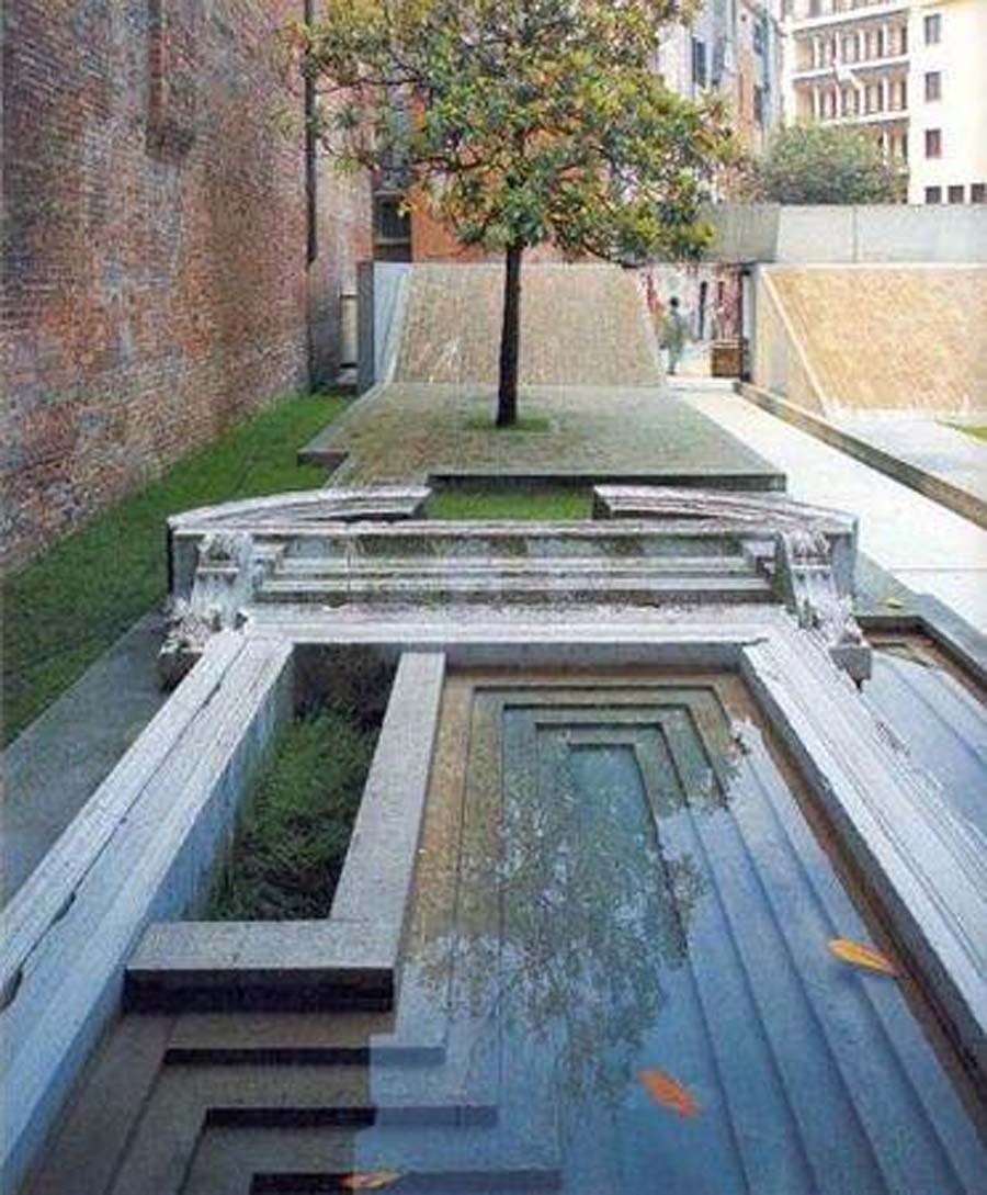 另外,威尼斯建筑学院校舍入口改造,对过程中出土的一个16世纪大门的处理也堪称神来之笔,斯卡帕摒弃了用作入口供师生出入的做法,而选择将这个门框当作水池使用,置于庭院之中,在其中设计曲折迂回的线脚。“层层塌陷的线角犹如历史之”古层“,同时恰好符合叠水跌落之势,季节不同,残骸底部时隐时现,形成遗迹旷古幽奥之感,犹如一位老人在讲解着历史现场,引起观者的驻足和凝思“。(本段部分文字来源,潘玥)