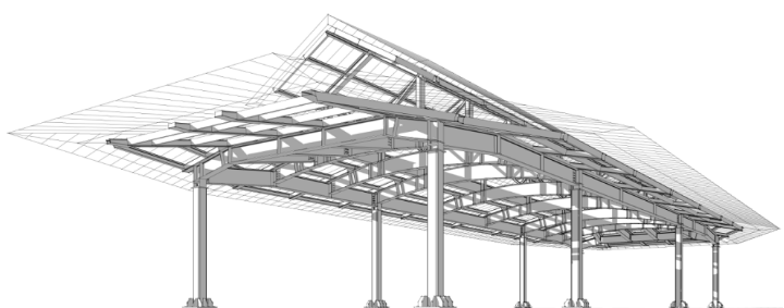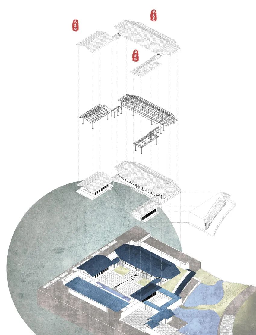 结构创意灵感来源于中式传统木构设计, 取其穿梁搭接体系之精髓,利用结构创新设计将中式传统空间的重檐营造、深远挑檐、轻巧构造以及通透自由的空间予以充分的表现。